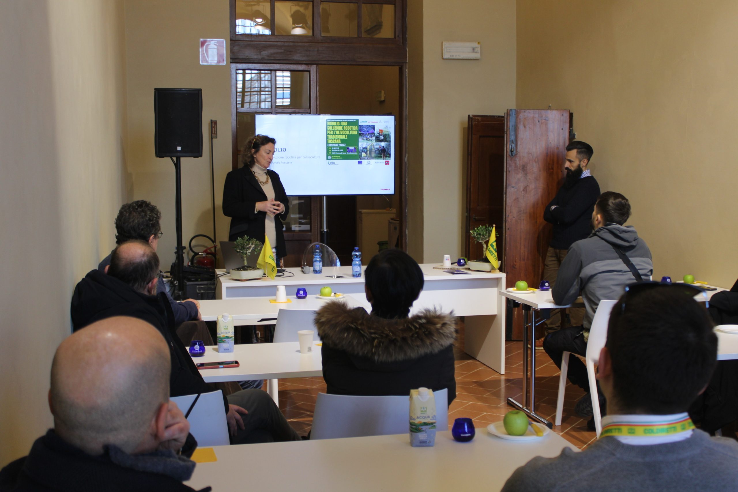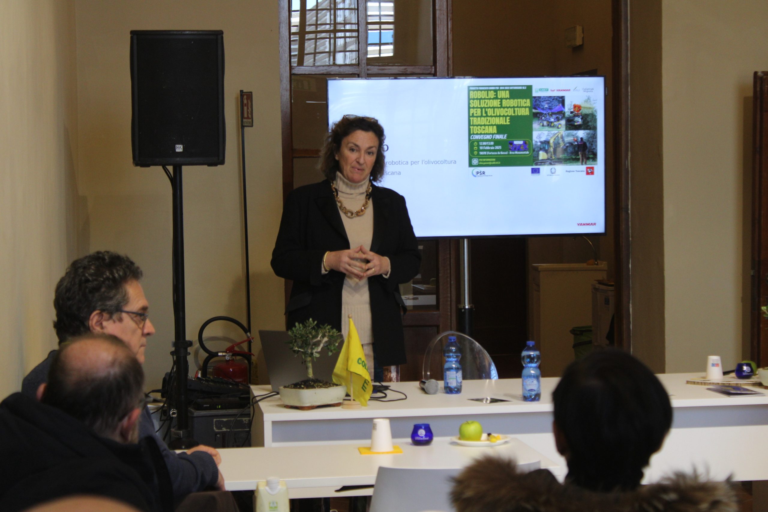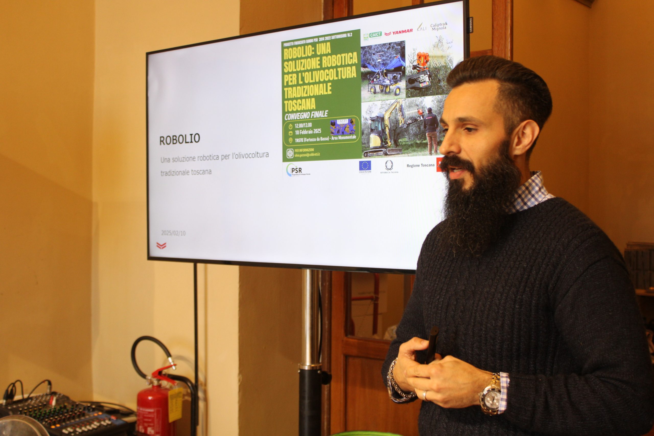 Robotica ed intelligenza artificiale scendono il campo al servizio dell’olivicoltura tradizionale per aiutare gli agricoltori a ridurre i tempi ed i costi della raccolta delle olive nelle campagne dove è sempre più difficile trovare manodopera e migliore la redditività. Presentato a Taste 18, il salone del gusto che si è tenuto alla Fortezza da Basso, a Firenze, il progetto “Robolio”, il “robot-olivicoltore” sviluppato nell’ambito del bando PSR 2014-2022 sottomisura 16.2 dalla collaborazione tra le imprese olivicole Kali e Caliptra & Mignola, il centro di ricerca e sviluppo del gruppo Yanmar di Pontedera e Coldiretti Toscana. Lo sviluppo di questo particolare progetto nascedall’esigenza di automatizzare e rendere più sostenibile economicamente il processo di raccolta delle olive che incide per il 30/40% sui costi di produzione in particolare nelle aree più svantaggiate e con declivi impegnativi considerando che in Toscana ci sono 4 milioni di olivi abbandonati. Alla presentazione alle aziende olivicole hanno partecipato l’agronoma e partner di progetto Fiammetta Nizzi Griffi insieme ad Alfredo Argiolas e Marta Niccolini di Yanmar Firenze. “Uno dei più grossi problemi dell’olivicoltura tradizionale è la raccolta manuale delle olive che ha costi molto alti. L’altra criticità è rappresentata dalle tempistiche: le olive devono essere frante poche ore dopo la raccolta per poter ottenere un prodotto di qualità e con la raccolta manuale non è sempre possibile”: spiega Iacopo Gentilini, imprenditore olivicolo e titolare dell’azienda Kali da cui è scattata la scintilla. Gentilini è docente negli Stati Uniti di robotica: “il mio background in meccanica robotica unito alla mia passione per l’olivicoltura mi hanno portato a cercare una soluzione alternativa e complementare alla raccolta manuale. Trovare forza lavoro ed averla disponibile quando è il momento di raccogliere, tenendo ben a mente che i cambiamenti climatici possono anticipare o far slittare di giorni o settimane questa operazione, è sempre più complicato. Da qui è nata l’idea, grazie alla partnership di Yanmar, di avviare lo sviluppo di un robot autonomo in grado di raccogliere le olive nelle più varie geometri di impianto esistenti in Toscana. Attualmente non esiste ancora sul mercato, a differenza dell’olivicoltura intensiva,  un robot  per la tradizionale. La macchina che stiamo testando in campo permetterebbe di effettuare la raccolta in maniera autonoma, 24 ore su 24, sopperendo alle difficoltà di manodopera. Siamo ancora alle fasi iniziali”.