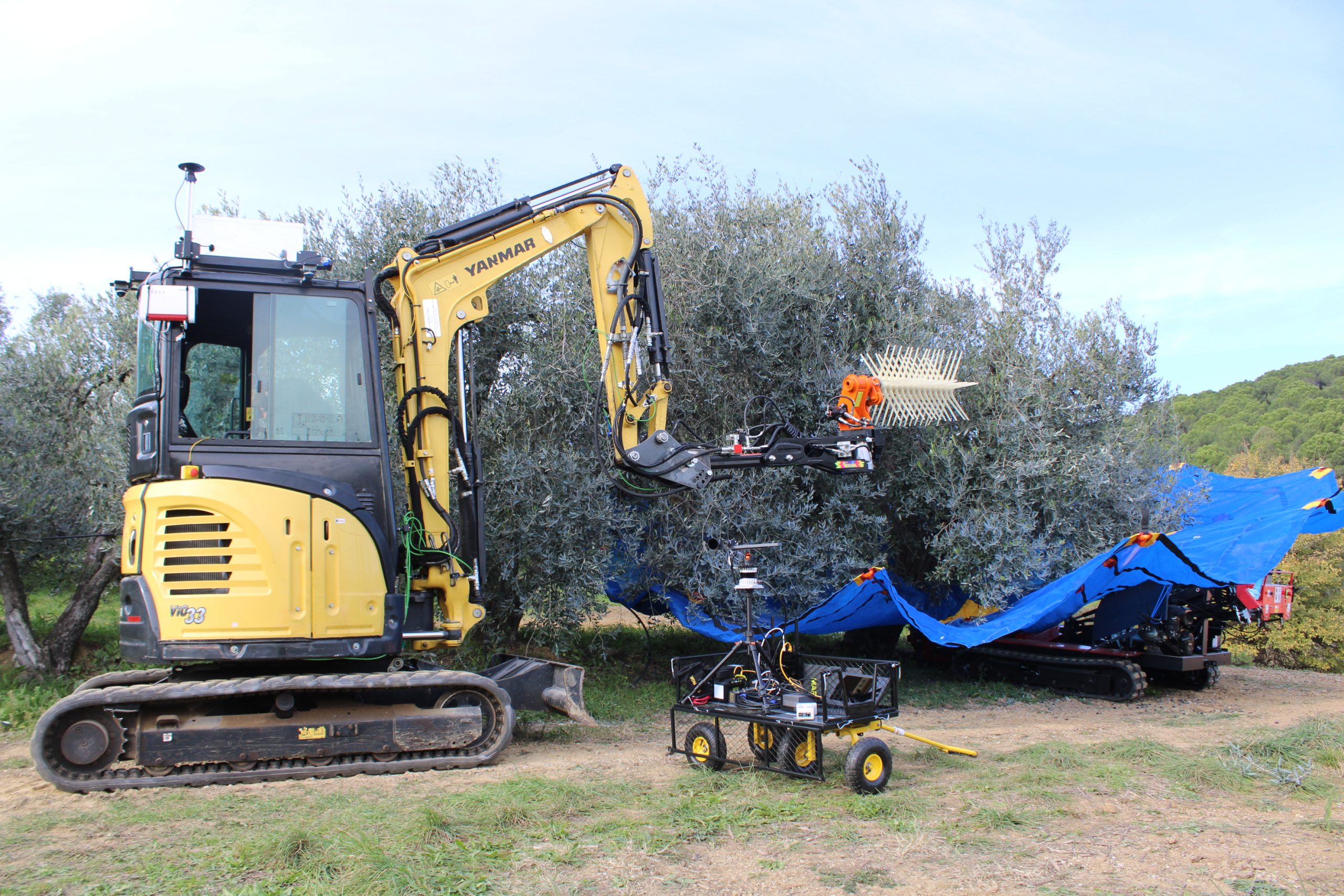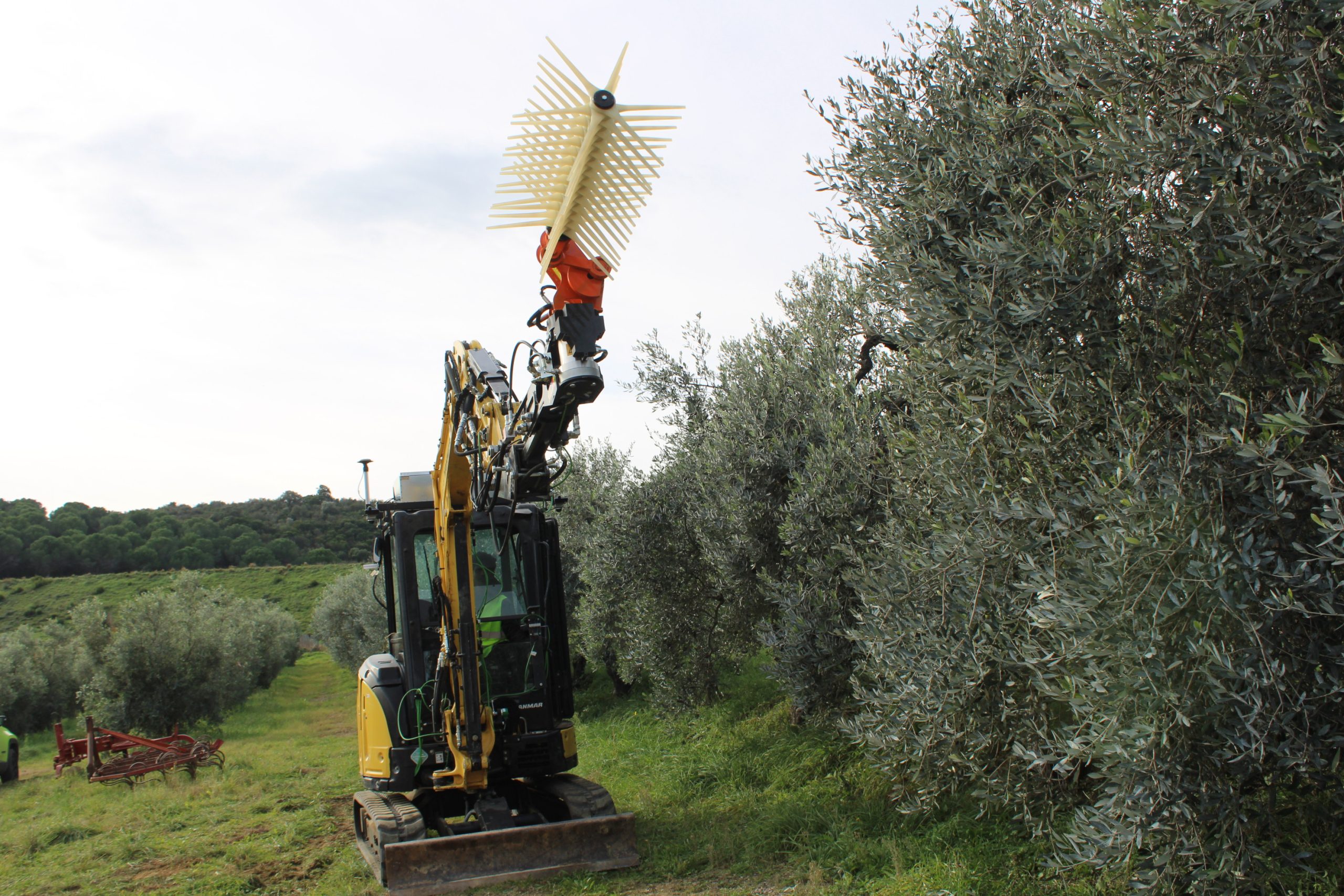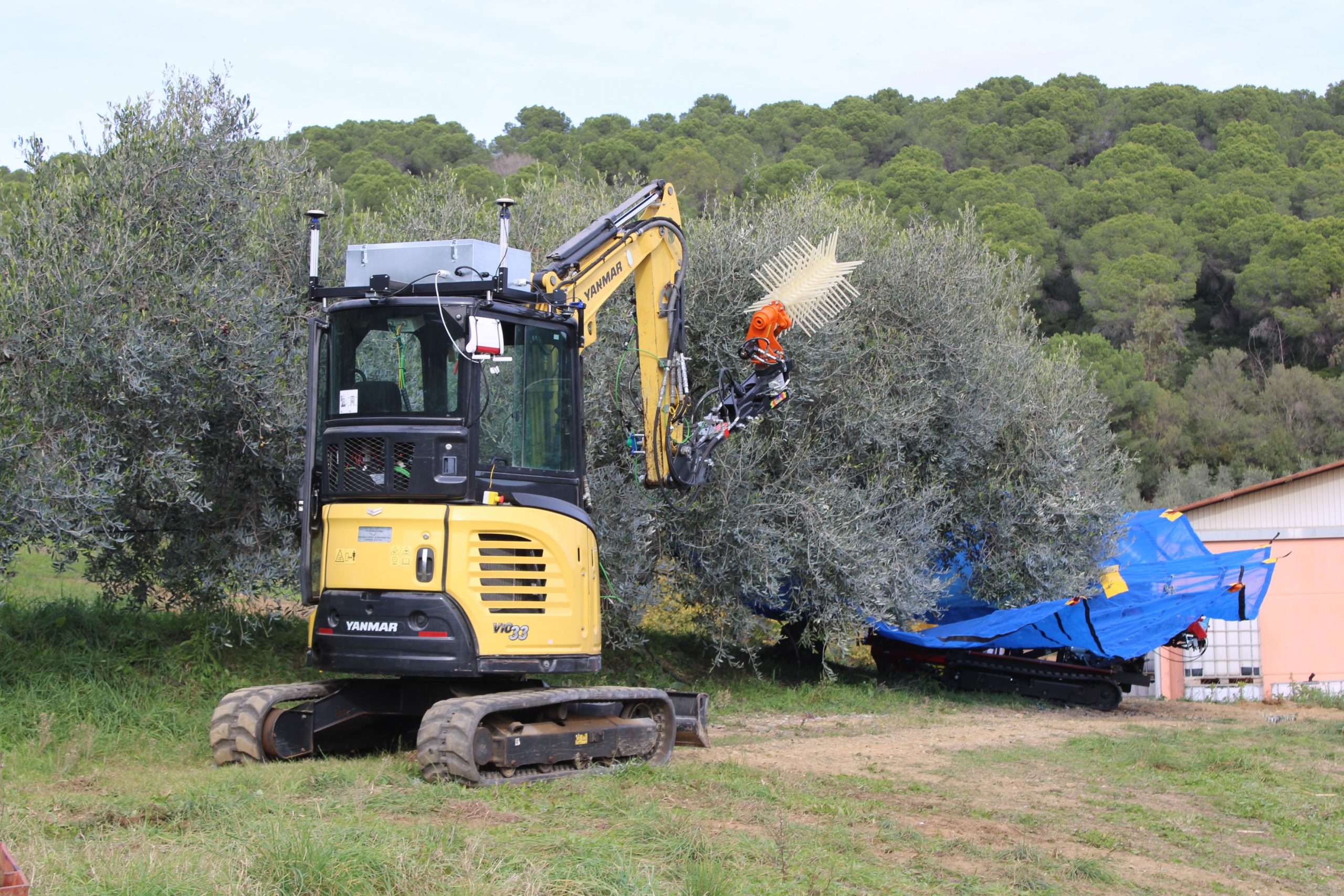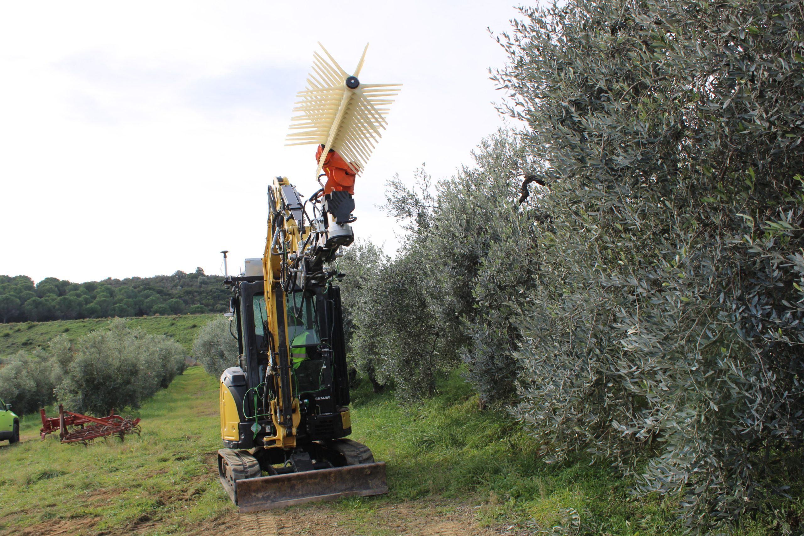 Il raccoglitore autonomo - hanno spiegato i ricercatori della Yanmar di Firenze - utilizza il braccio di un piccolo escavatore, una macchina spesso in uso nelle aziende agricole, come un vero e proprio braccio robotico, ed è dotato di uno scuotitore commerciale opportunamente sensorizzato e di un ombrello rovesciato per la raccolta, componenti che sono integrati attraverso software, tool, telecamere, sensori per consentire la raccolta senza danneggiare i frutti. La mappatura digitale della pianta, una informazione essenziale per consentire al robot olivicoltore di identificare le caratteristiche dell’olivo circostante, è realizzata attraverso camere e telerilevamento rielaborate dall’intelligenza artificiale mentre particolari e specifici software sono stati sviluppati appositamente per ricreare le condizioni spaziali circostanti. Il robot si trova attualmente ancora in fase di test e rappresenta una prima pratica applicazione della combo robotica ed intelligenza artificiale nel settore dell’olivicoltura tradizionale.