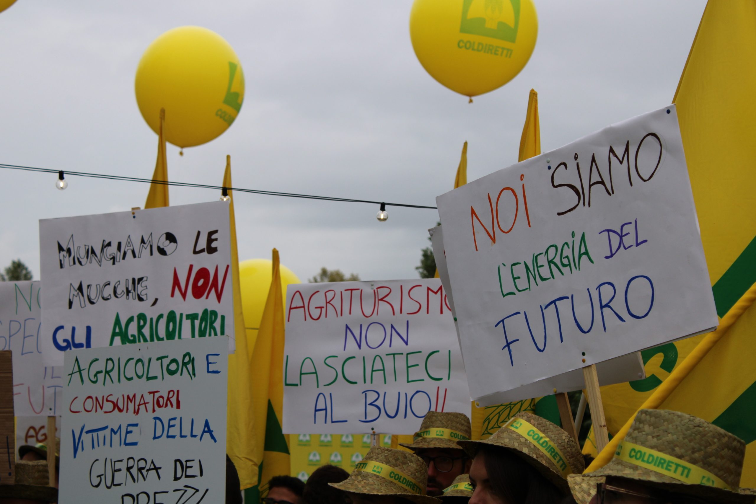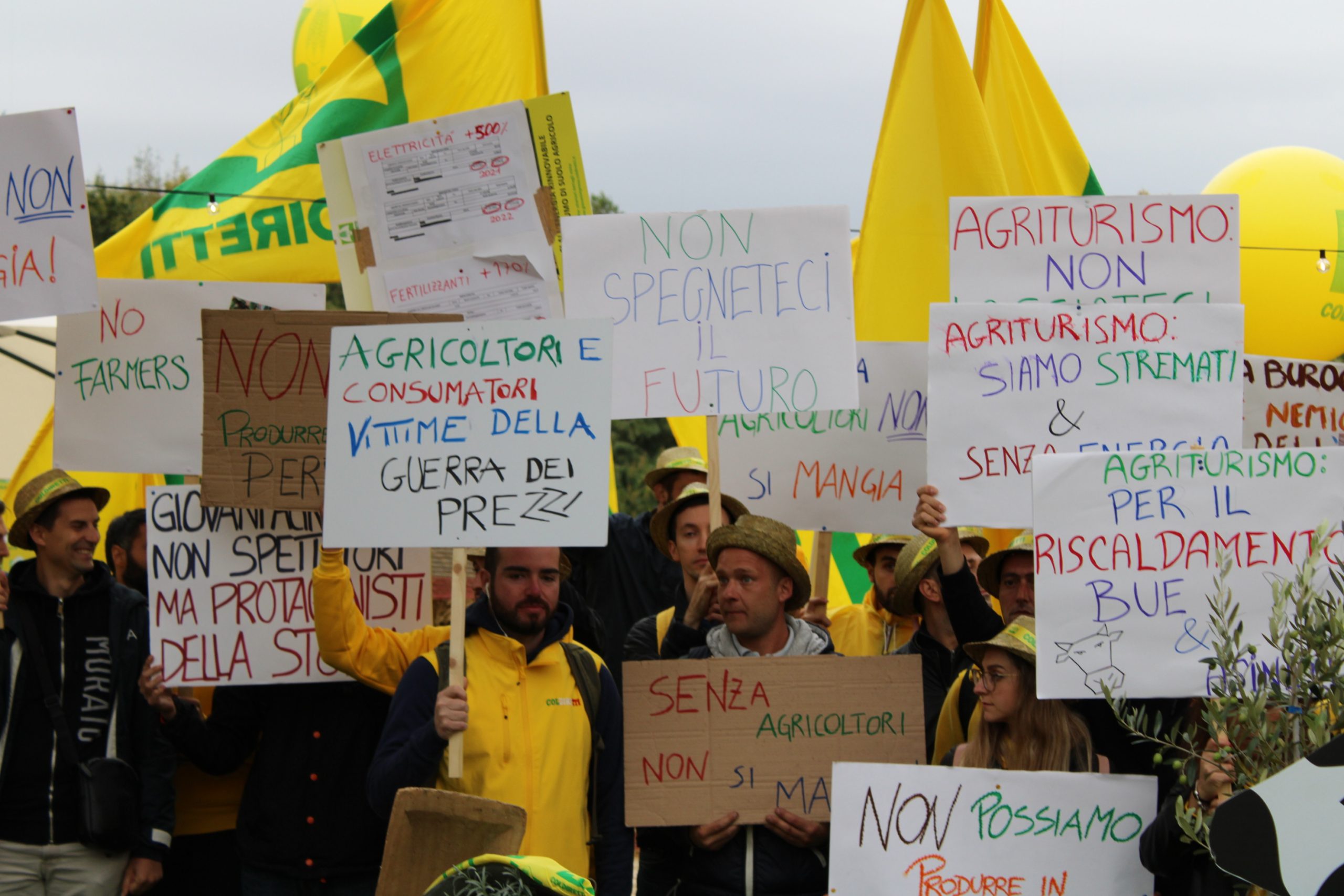 I giovani della Coldiretti hanno indossato i propri indumenti e strumenti di lavoro, dalla tuta e gli stivali di chi accudisce gli animali nelle stalle alle reti dei pescatori, fino alle tute degli apicoltori, accompagnati dall’asinella Terra, divenuta il simbolo della protesta. Sui cartelli dei manifestanti che hanno agitato per tutta la mattina la sintesi delle loro preoccupazioni: “Senza agricoltura non si mangia”, “Lavoriamo 24 ore per il contatore”, “Fermiamo le speculazioni”, “Mungiamo le mucche, non gli allevatori”, “No Farmers No Food”, “La burocrazia uccide i campi”. Molti hanno portato le proprie produzioni messe a rischio dai rincari energetici (la Piattella pisana, il fagiolo zolfino ed il fico di Carmignano tra i prodotti toscani), che non risparmiano dunque neppure la parte più avanzata del settore agricolo, diventato di fatto il punto di riferimento importante per le nuove generazioni, tanto che nell’ultimo anno sono nate in media 17 nuove imprese giovani al giorno, secondo l’analisi Coldiretti-Divulga.
