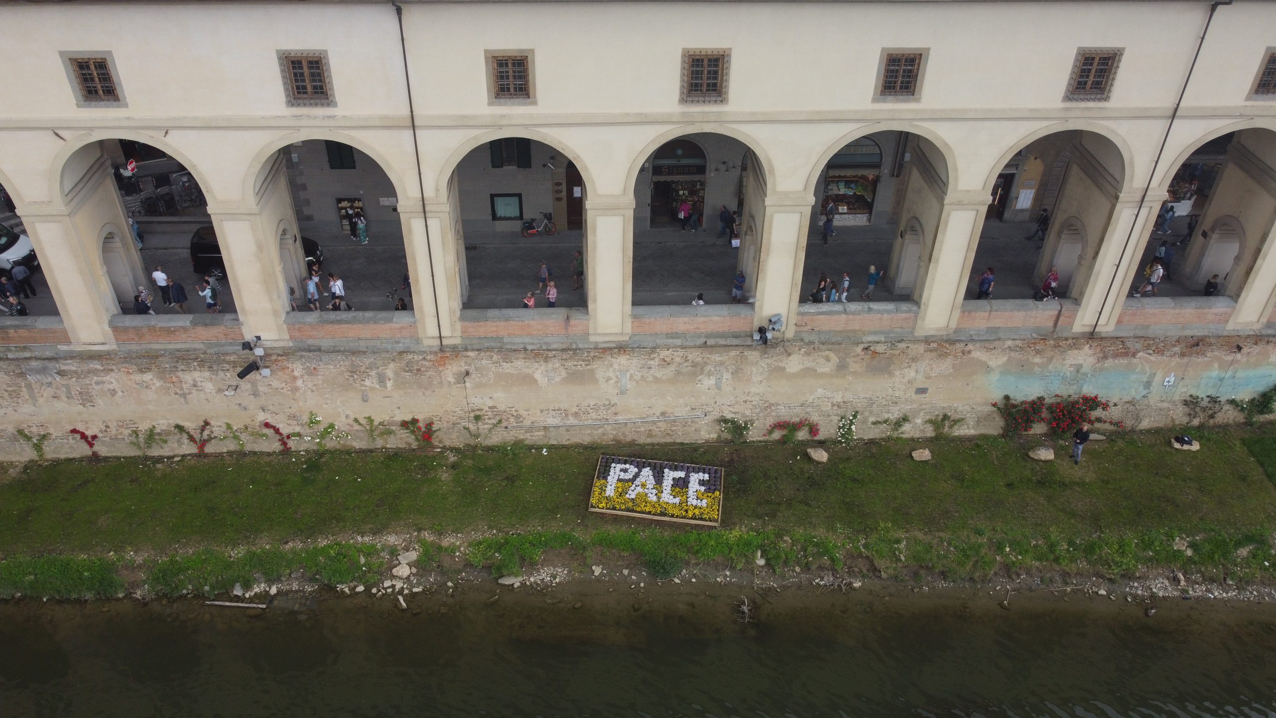 In un giorno da molti considerato piuttosto cruciale per l’andamento dell’attuale conflitto europeo Firenze lancia un nuovo grande messaggio di pace con una scritta di fiori sulla sponda del Fiume Arno. In uno dei luoghi simbolo della città ma anche della Toscana, d’Italia e celebre in tutto il mondo proprio sotto il Ponte Vecchio e la Galleria degli Uffizi è apparsa una grande scritta PACE, realizzata con fiori bianchi su sfondo giallo e blu, perché cessino le armi e si apra il dialogo in Ucraina così come in ogni altro conflitto del mondo.
