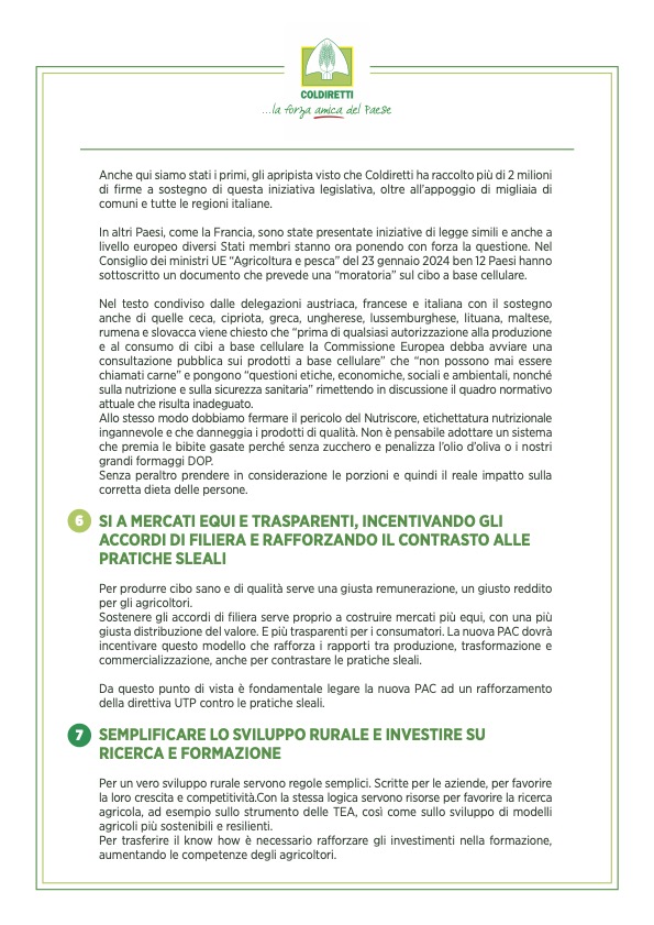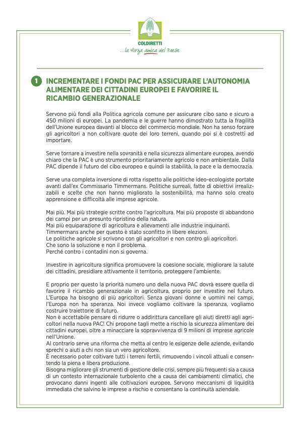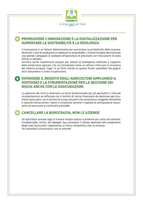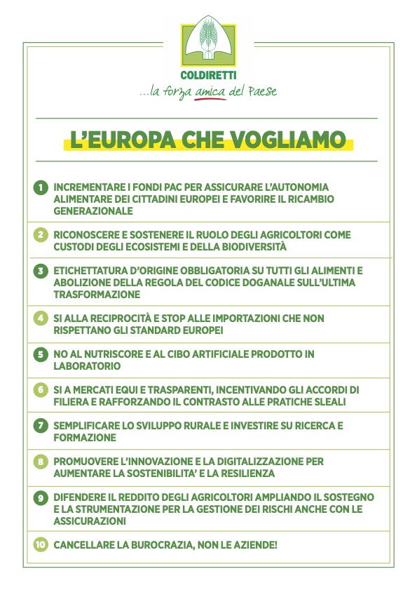 Sono dieci i punti del manifesto che delinea la traiettoria sindacale di Coldiretti per la prossima legislatura: dall’incremento dei fondi della Politica Agricola Comune, la tanto criticata Pac, per assicurare così cibo sano e sicuro a tutti i cittadini europei allo stop alla concorrenza sleale introducendo il principio di reciprocità per fare in modo che tutti i prodotti che entrano nell’Unione Europea rispettino gli stessi standard dal punto di vista ambientale, sanitario e delle norme sul lavoro previste dal mercato interno, dal no al nutriscore e al cibo artificiale prodotto in laboratorio i cui effetti sulla salute dei consumatori sono sconosciuti seguendo l’esempio dell’Italia che ha approvato una legge che ne vieta la produzione e commercializzazione al rafforzamento delle azioni contro le pratiche sleali ed ancora la semplificazione e alleggerimento degli oneri burocratici che costano tempo e denaro ed erodono risorse importanti alle imprese e più risorse e strumenti per accompagnare l’innovazione e la gestione del rischio nelle campagne dove sostenibilità e cambiamenti climatici sono sfide prioritarie.