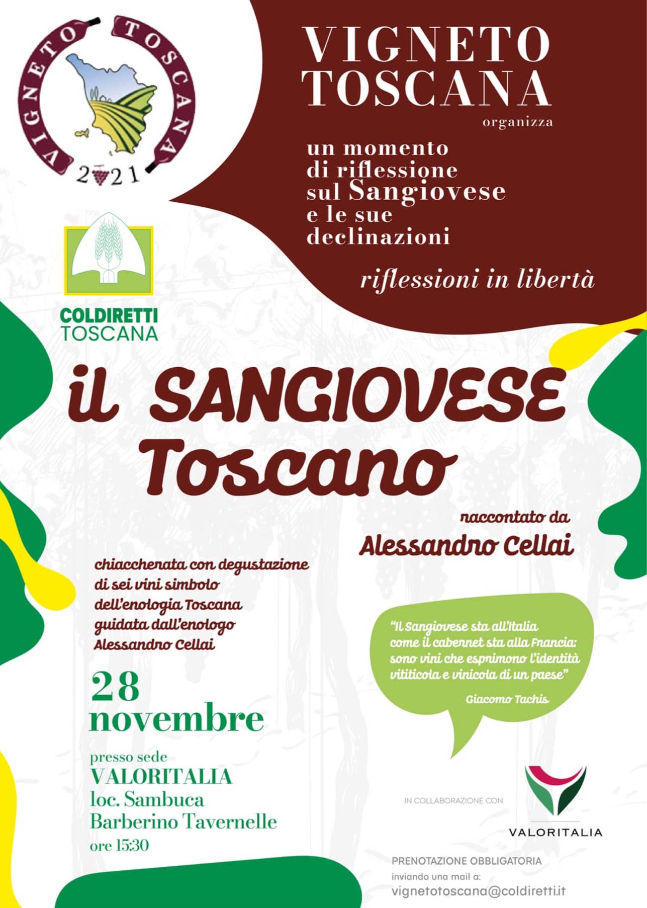 Il Sangiovese Toscano raccontato dall’enologo Alessandro Cellai attraverso la degustazione di sei DOC simbolo del territorio. Il Sangiovese è il primo vitigno regionale, base indispensabile dei grandi rossi toscani, amati dagli appassionati e celebrati dagli addetti ai lavori. Al via con un evento d’autore il ciclo di appuntamenti formativi ed informativi promossi da Vigneto Toscana, l’associazione dei viticoltori di Coldiretti, per aggiornare e migliorare le conoscenze tecniche ma anche normative delle aziende vitivinicole della regione.